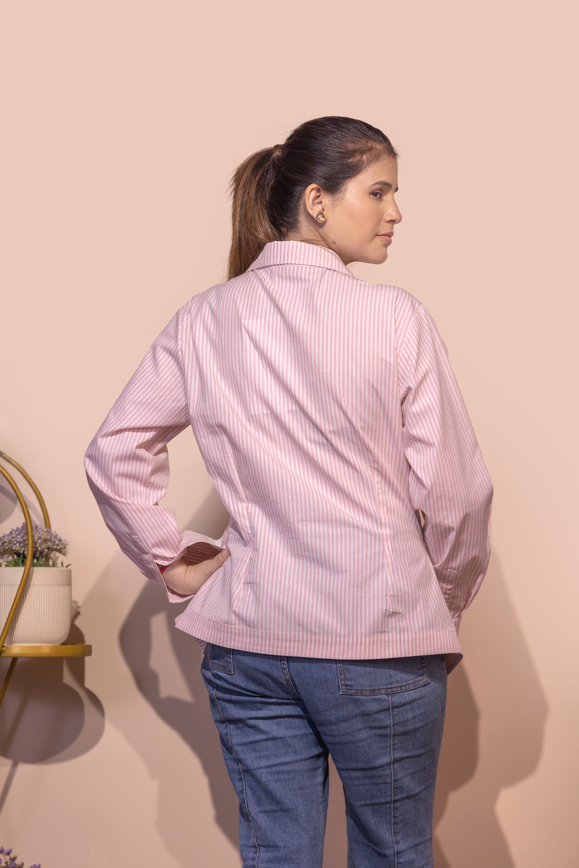 Step out in style with this pink asymmetric wrap pinstripe shirt, designed to make a statement while keeping comfort in mind. The subtle pinstripes and wrap silhouette create a flattering, modern fit, while the asymmetric hem adds a touch of contemporary flair. Ideal for office days, brunch dates, or casual meet-ups, this versatile shirt pairs effortlessly with trousers, skirts, or jeans for a chic look.