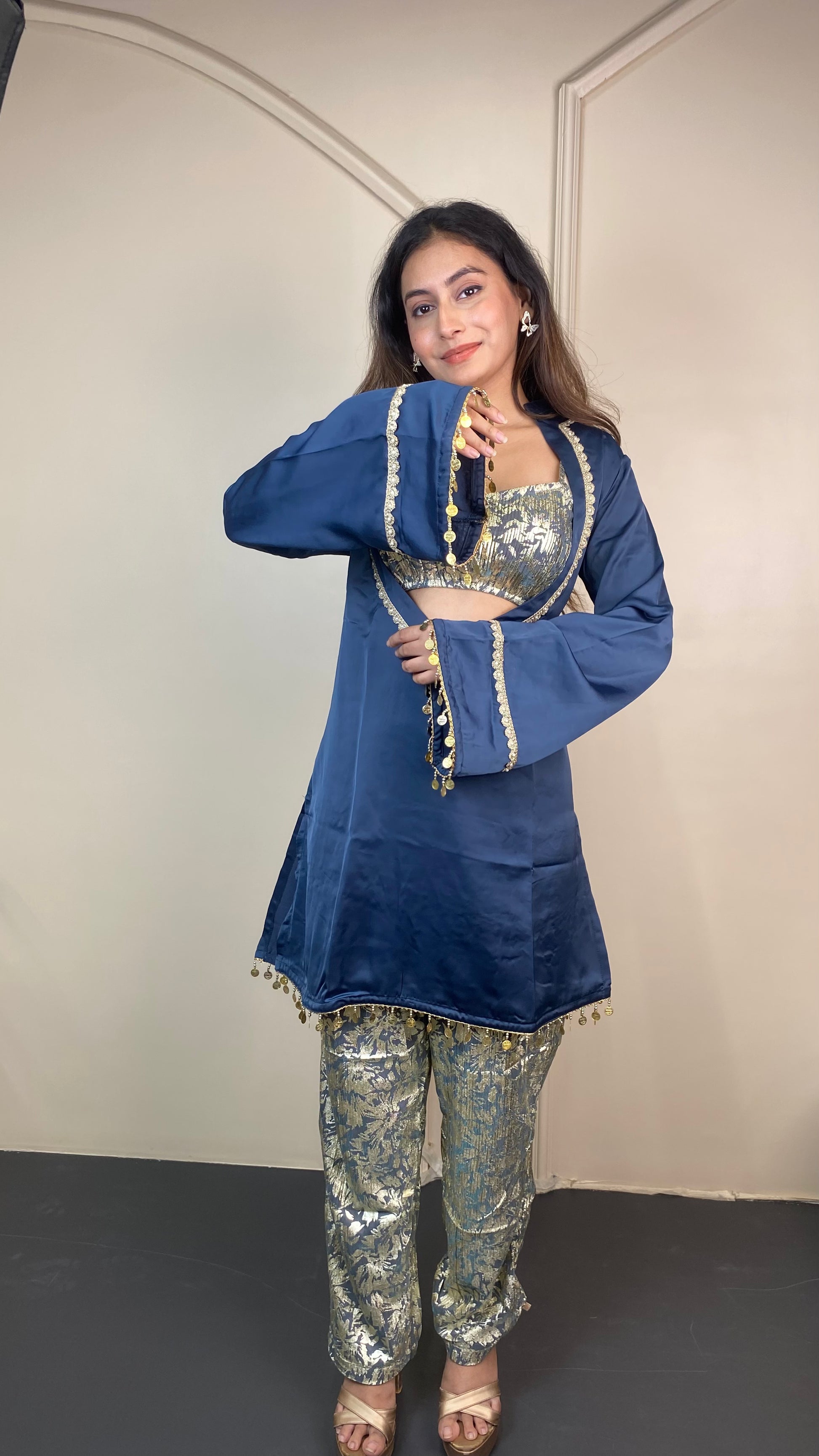 Make a bold statement with this Foil Print Cut-Out Kurta Set, blending traditional elegance with a contemporary twist. The outfit features a shimmering foil-printed bustier and pants paired with a navy blue cut-out style kurta adorned with delicate lace trims and playful tassel details. Designed for modern festive celebrations, this chic ensemble balances glamour and comfort, making it a perfect choice for weddings, parties, and festival.