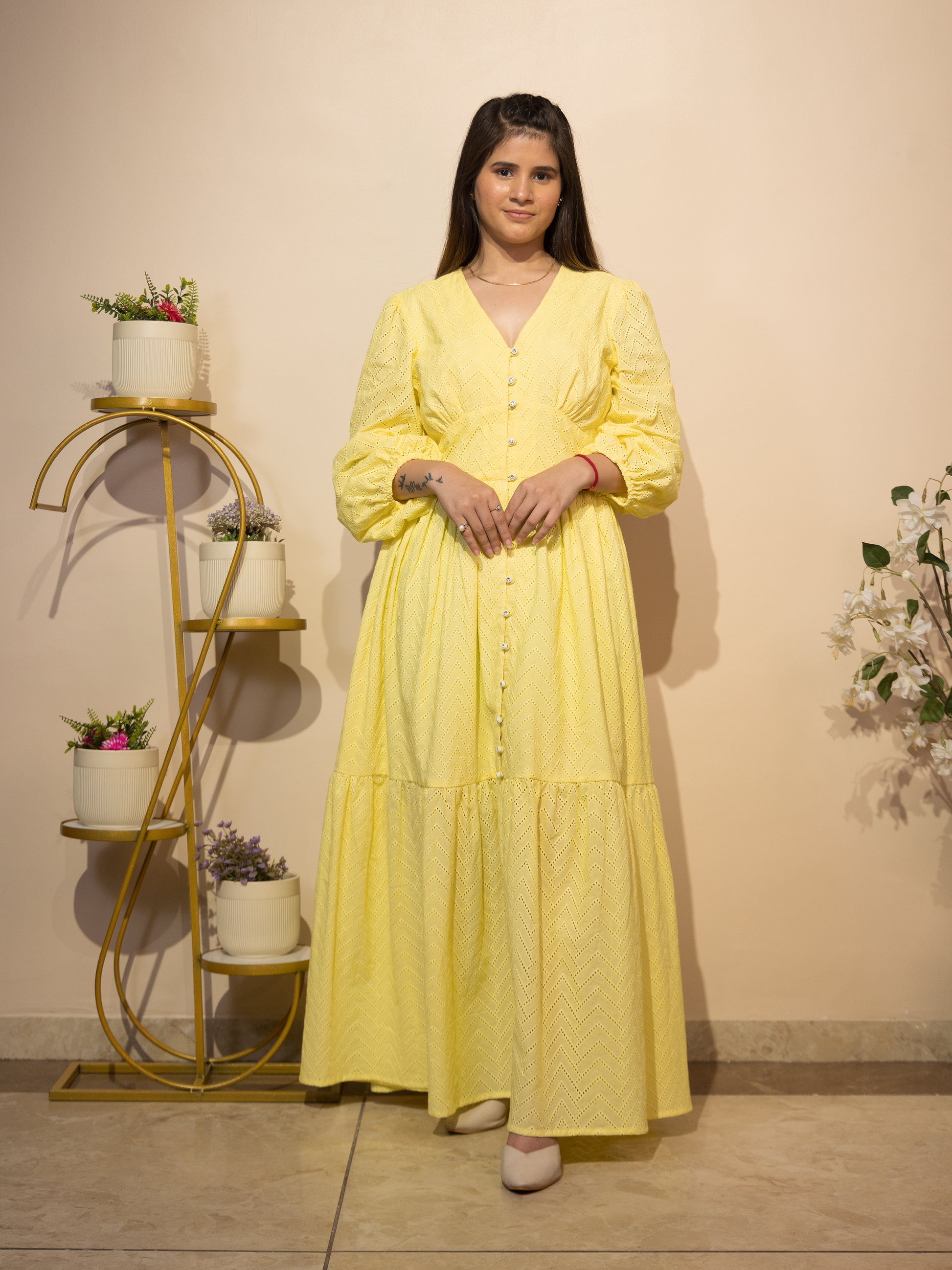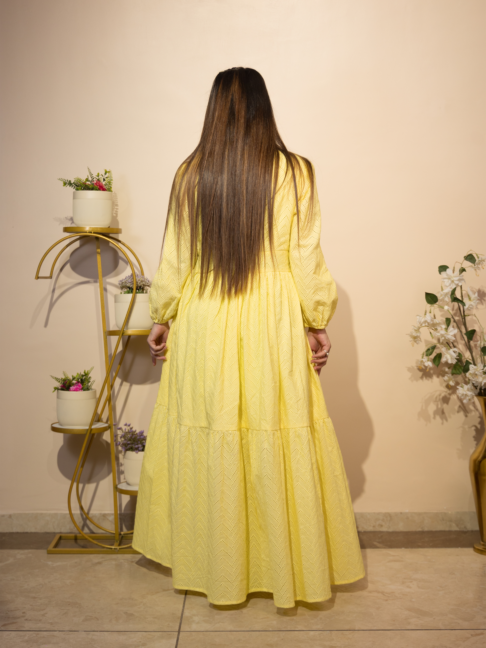 Bring playful elegance to your style with this Yellow Schiffli Flared Dress. Crafted with detailed embroidery and a flowy silhouette, it blends comfort with timeless design. A versatile choice for brunch, day trips, or festive summer occasions.